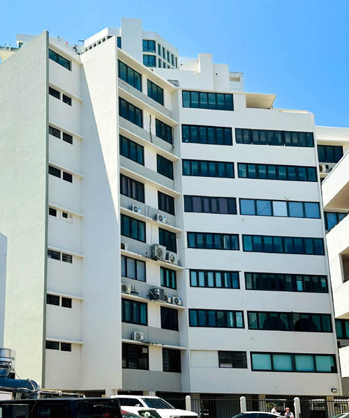Las ventanas son de diferentes tamaños enmarcadas con perfiles metálicos oscuros. El edificio tiene balcones cerrados con cristales, lo que añade una apariencia uniforme al exterior. Se observan aires acondicionados instalados en varias ventanas y una combinación de superficies lisas y rugosas en las paredes. La planta baja tiene un acceso techado y un área para estacionamiento, reflejando la creciente dependencia del automóvil en los años