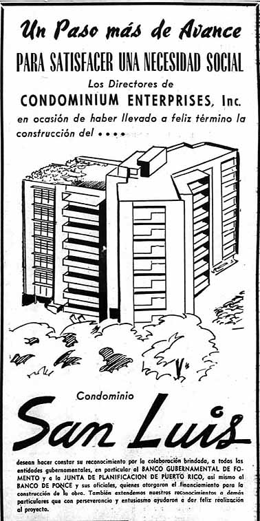El Banco Gubernamental de Fomento y el Banco de Ponce decidieron dar el respaldo necesario para que se iniciará en Puerto Rico la construcción de edificios en condominio. Fue así que la corporación integrada por don Luis J. Rodríguez, don Luis Esteban Juliá y la esposa de éste último, señora Gilda Juliá lograron el financiamiento para la construcción del Condominio San Luis, el primero de su clase que comenzó a construirse en Puerto Rico. El deseo de estos hombres de negocios que iniciaron este nuevo sistema de propiedad en Puerto Rico fue poder desarrollar proyectos de viviendas en condominio para sustituir o suplantar el sistema de viviendas públicas.